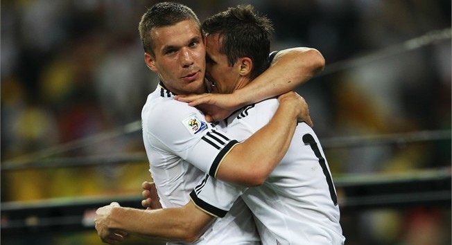 Gol pertama oleh Lukas Podolski pada minit ke-8